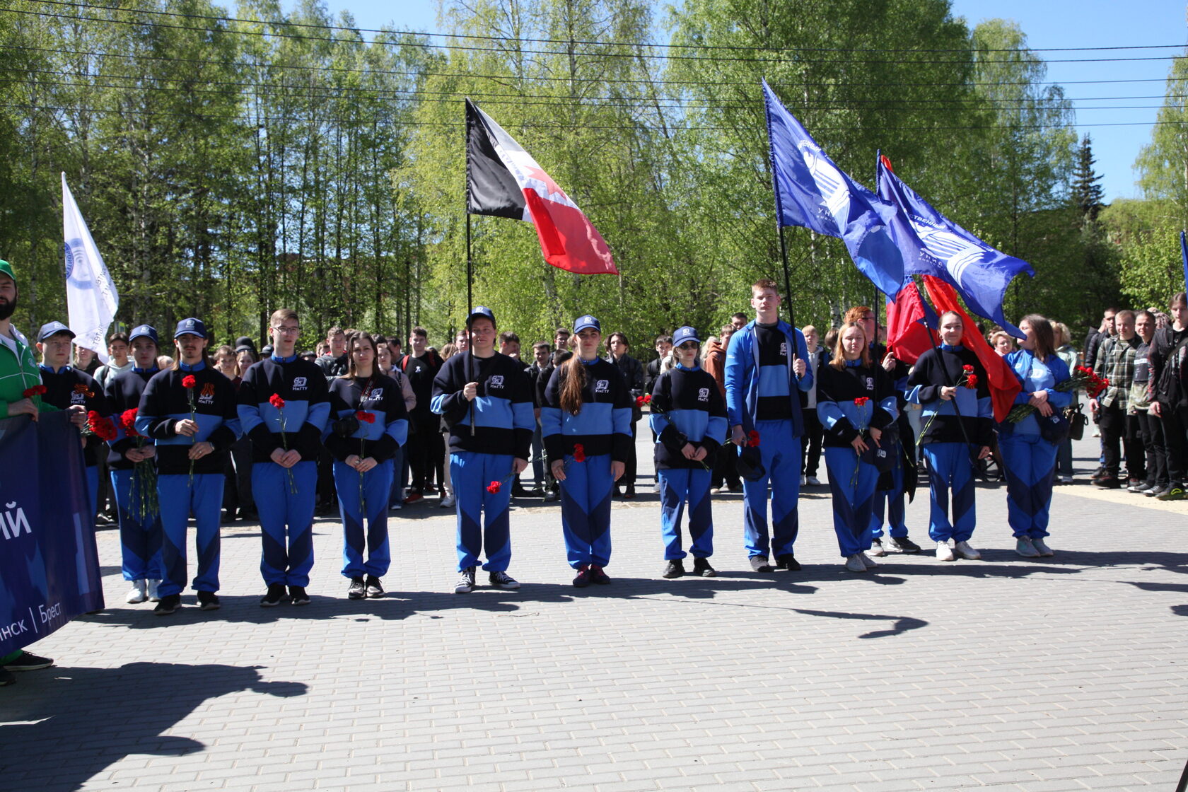 В праздничное утро 9 мая студенты - участники пробега отправились в Парк Победы, к Вечному огню, где возложили красные гвоздики, а затем стали зрителями парада Победы и посетили музей Михаила Тимофеевича Калашникова.