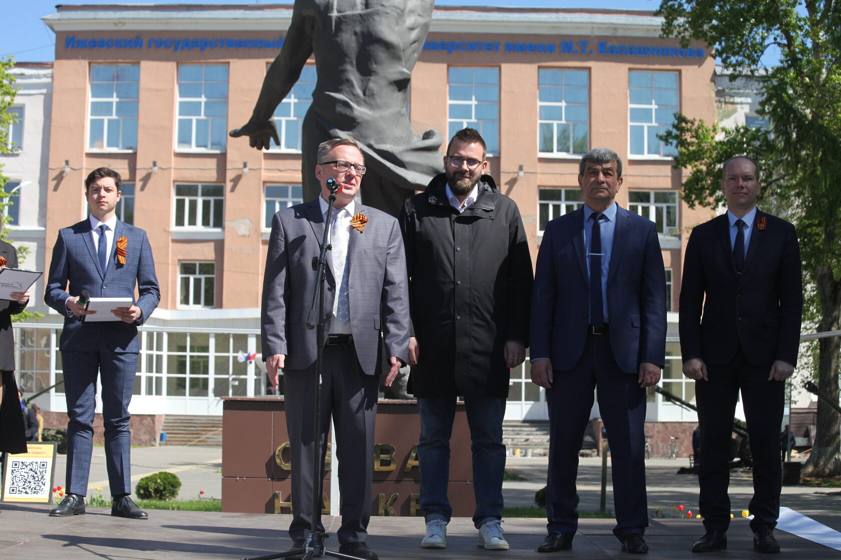 В этот же день состоялся приветственный митинг участников пробега в Студенческом городке ИжГТУ на площади перед памятником «Слава науке» («Вечный студент»). На митинге выступили и.о. ректора ИжГТУ Александр Губерт, руководитель агентства по молодежной политике Удмуртии Алексей Выстребов, руководители делегаций вузов партнеров, затем члены делегаций, руководство и сотрудники ИжГТУ возложили цветы к памятнику М.Т. Калашникову и памятнику «Оружейникам Удмуртии, героям трудового фронта Великой Отечественной войны 1941-1945 гг.».