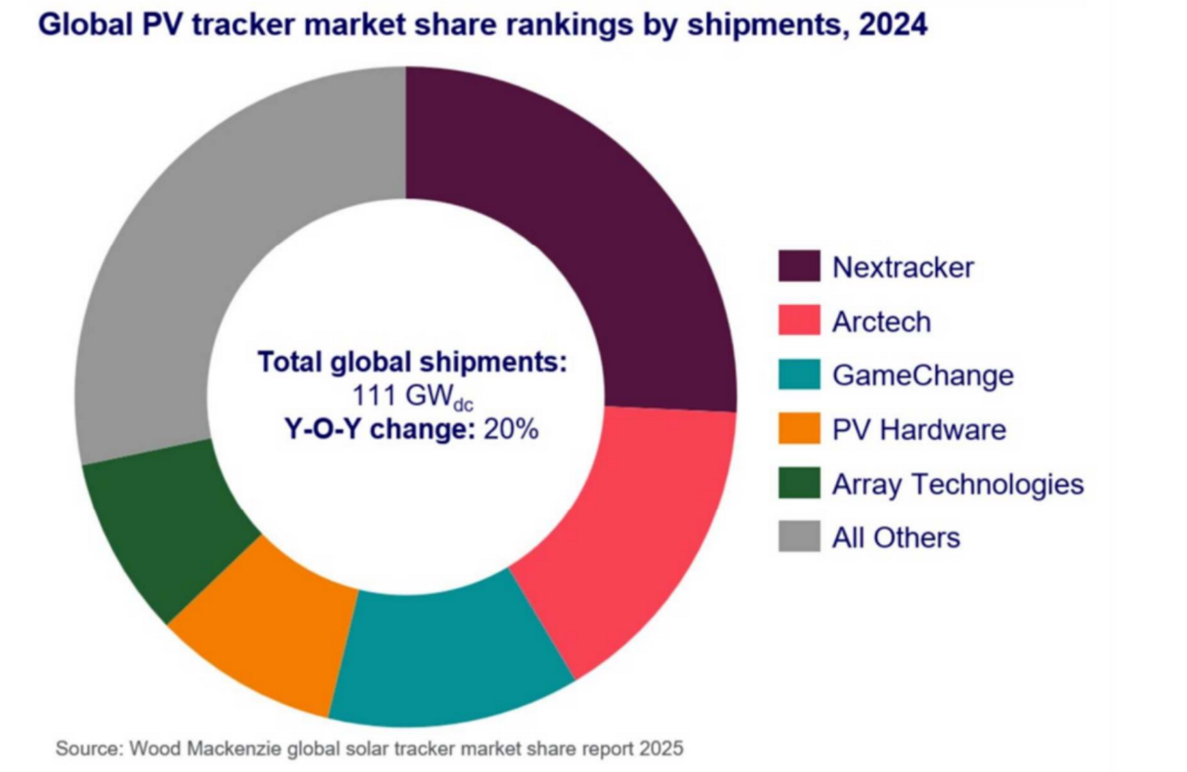 Мировой рынок солнечных трекеров вырос на 20% в годовом исчислении и составил рекордные 111 ГВт в 2024 году. Такие данные публикует исследовательская компания